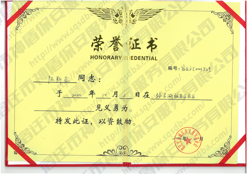 保安員見義勇為獲獎證書